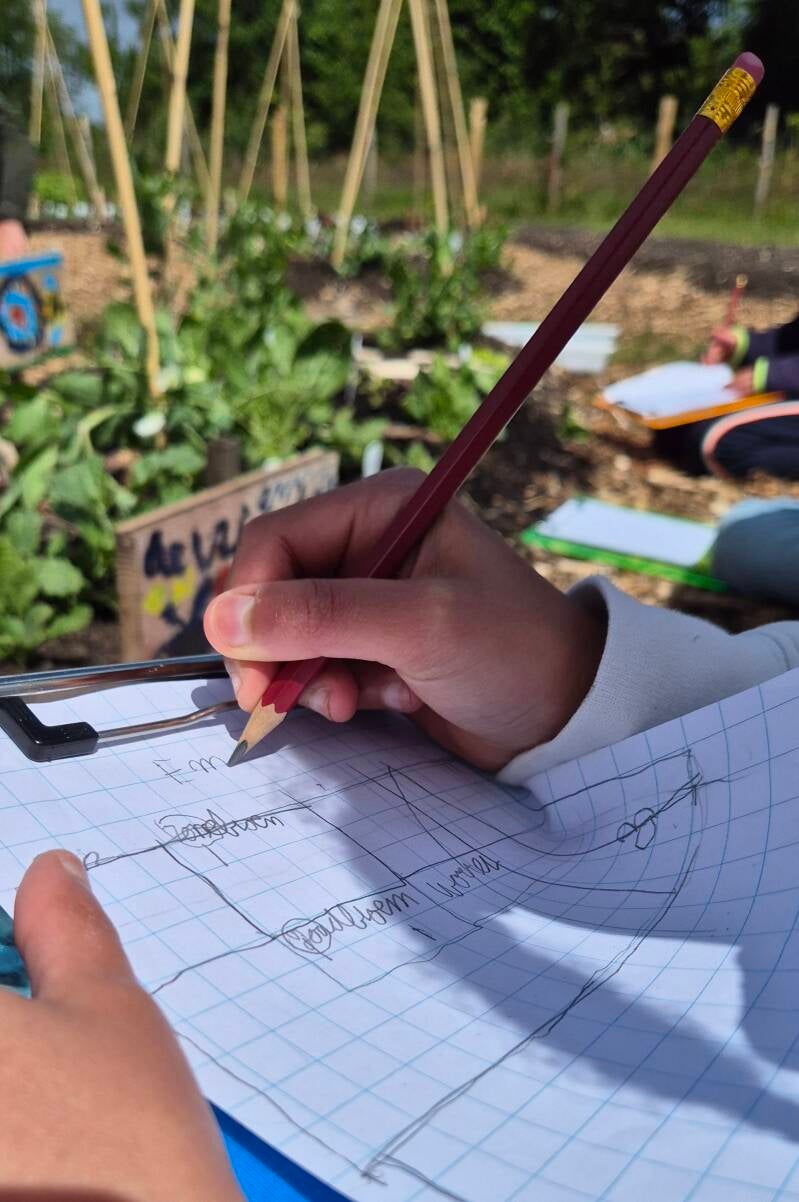 Groep 5 ging vandaag rekenen in de tuin. Met een koord met knopen hebben ze de eigen tuin in kaart gebracht. Alle groepen zaaiden op de schoolmoestuin de laatste gewassen in de tuin, zonnebloemen en maïs. Nu hopen dat er wat regen gaat vallen de komende tijd.