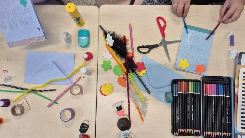 De voorbereidingen zijn in volle gang. Groepen 6 en 7 maken uitnodigingen voor het eindfeest. Een aantal seizoenen hebben ze hard gewerkt in hun eigen schoolmoestuin en dat moet gevierd worden.